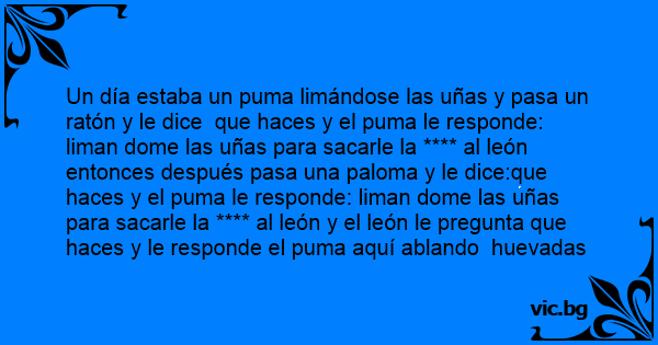 Un día estaba un puma limándose las uñas y pasa un ratón y le dice que haces y el puma le responde: liman dome las uñas para sacarle la **** al león entonces después pasa una paloma y le dice:que haces y el puma le responde: liman dome las uñas para sacarle la **** al león y el león le pregunta que haces y le responde el puma aquí ablando huevadas