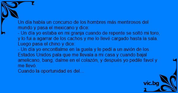 Un día había un concurso de los hombres más mentirosos del mundo y pasa el mexicano y dice:
