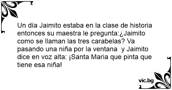 Un día Jaimito estaba en la clase de historia entonces su maestra le pregunta:¿Jaimito como se llaman las tres carabelas? Va pasando una niña por la ventana y Jaimito dice en voz alta: ¡Santa Maria que pinta que tiene esa niña!