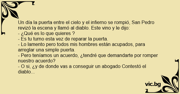 Un día la puerta entre el cielo y el infierno se rompió, San Pedro revizó la escena y llamó al diablo. Este vino y le dijo: