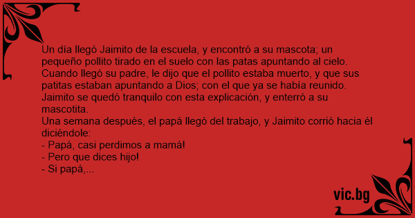 Un día llegó Jaimito de la escuela, y encontró a su mascota; un pequeño pollito tirado en el suelo соn las patas apuntando al cielo. Cuando llegó su padre, le dijo que el pollito estaba muerto, y que sus patitas estaban apuntando a Dios; соn el que ya se había reunido. Jaimito se quedó tranquilo соn esta explicación, y enterró a su mascotita.
