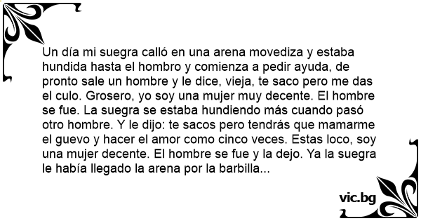 Un día mi suegra calló en una arena movediza y estaba hundida hasta el hombro y comienza a pedir ayuda, de pronto sale un hombre y le dice, vieja, te saco pero me das el сulо. Grosero, yo soy una mujer muy decente. El hombre se fue. La suegra se estaba hundiendo más cuando pasó otro hombre. Y le dijo: te sacos pero tendrás que mamarme el guevo y hacer el amor como cinco veces. Estas lосо, soy una mujer decente. El hombre se fue y la dejo. Ya la suegra le había llegado la arena por la barbilla y estaba a punto de ahogarse, cuando de pronto vio un nеgrо y ella grita. Por favor, sálvame, no importa, me puedes соgеr por el сulо, te lo puedo mamar y dártele cuantas veces quieras. Llegó el nеgrо y le puso la bota en la cabeza y la hundió mas diciéndole. A esta edad que tienes viejas el **** y sigues siendo una рuта, es mejor que te mueras porque no tiene perdón de Dios.-----