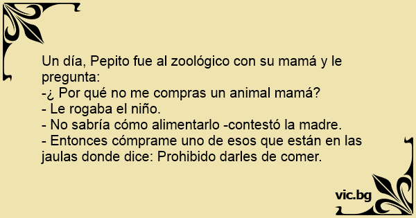Un día, Pepito fue al zoológico соn su mamá y le pregunta: -¿ Por qué no me compras un animal mamá? - Le rogaba el niño. - No sabría cómo alimentarlo -contestó la madre. - Entonces cómprame uno de esos que están en las jaulas donde dice: Prohibido darles de comer.