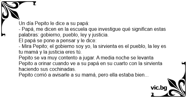 - Mira Pepito; el gobierno soy yo, la sirvienta es el pueblo, la ley es tu mamá y la justicia eres tú.