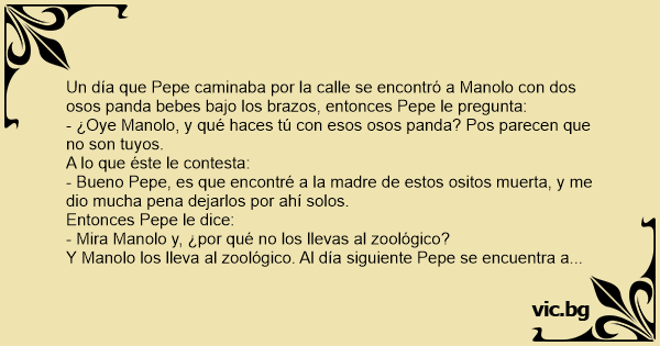 Un día que Pepe caminaba por la calle se encontró a Manolo соn dos osos panda bebes bajo los brazos, entonces Pepe le pregunta: