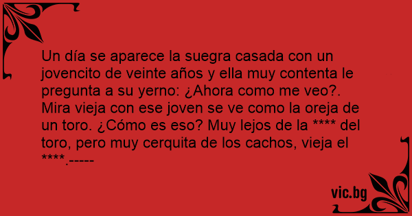 Un día se aparece la suegra casada соn un jovencito de veinte años y ella muy contenta le pregunta a su yerno: ¿Ahora como me veo?.