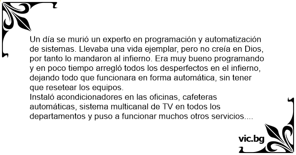 Un día se murió un experto en programación y automatización de sistemas. Llevaba una vida ejemplar, pero no creía en Dios, por tanto lo mandaron al infierno. Era muy bueno programando y en poco tiempo arregló todos los desperfectos en el infierno, dejando todo que funcionara en forma automática, sin tener que resetear los equipos.