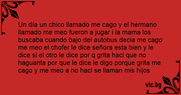 Un día un chico llamado me cago y el hermano llamado me meo fueron a jugar i la mama los buscaba cuando bajo del autobus decia me cago me meo el chofer le dice señora esta bien y le dice si el otro le dice por q grita haci que no haguanta por que le dice le digo porque grita me cago y me meo a no haci se llaman mis hijos