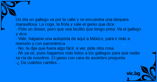 Un día un gallego va por la calle y se encuentra una lámpara maravillosa. La coge, la frota y sale el genio que dice: