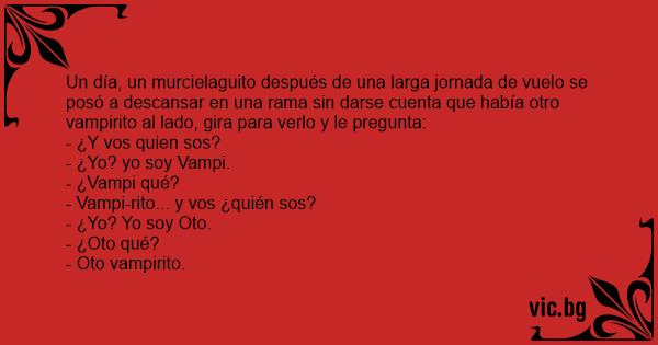 Un día, un murcielaguito después de una larga jornada de vuelo se posó a descansar en una rama sin darse cuenta que había otro vampirito al lado, gira para verlo y le pregunta: - ¿Y vos quien sos? - ¿Yo? yo soy Vampi. - ¿Vampi qué? - Vampi-rito... y vos ¿quién sos? - ¿Yo? Yo soy Oto. - ¿Oto qué? - Oto vampirito.
