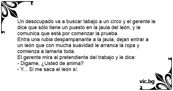 Un desocupado va a buscar tabajo a un circo y el gerente le dice que sólo tiene un puesto en la jaula del león, y le comunica que está por comenzar la prueba.