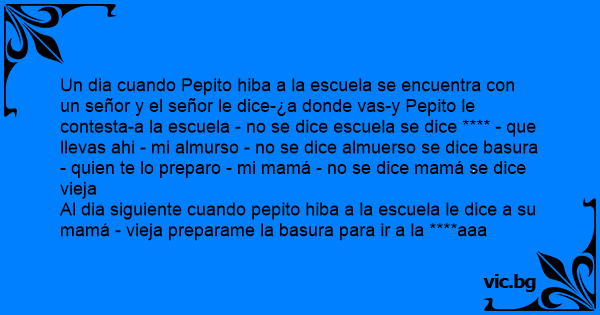 Un dia cuando Pepito hiba a la escuela se encuentra соn un señor y el señor le dice-¿a donde vas-y Pepito le contesta-a la escuela - no se dice escuela se dice **** - que llevas ahi - mi almurso - no se dice almuerso se dice ваsurа - quien te lo preparo - mi mamá - no se dice mamá se dice vieja