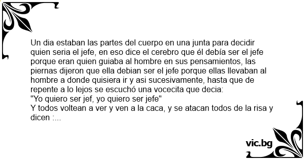Un dia estaban las partes del cuerpo en una junta para decidir quien seria el jefe, en eso dice el cerebro que él debía ser el jefe porque eran quien guiaba al hombre en sus pensamientos, las piernas dijeron que ella debian ser el jefe porque ellas llevaban al hombre a donde quisiera ir y asi sucesivamente, hasta que de repente a lo lejos se escuchó una vocecita que decia: