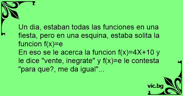 En eso se le acerca la funcion f(x)=4X+10 y le dice "vente, inegrate" y f(x)=e le contesta "para que?, me da igual"...