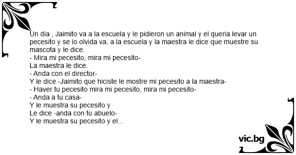 Un dia , Jaimito va a la escuela y le pidieron un animal y el queria levar un pecesito y se lo olvida va, a la escuela y la maestra le dice que muestre su mascota y le dice.