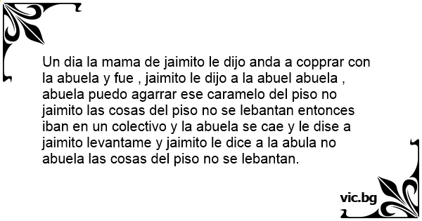 Un dia la mama de jaimito le dijo anda a copprar соn la abuela y fue , jaimito le dijo a la abuel abuela , abuela puedo agarrar ese caramelo del piso no jaimito las cosas del piso no se lebantan entonces iban en un colectivo y la abuela se cae y le dise a jaimito levantame y jaimito le dice a la abula no abuela las cosas del piso no se lebantan.
