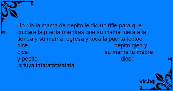 Un dia la mama de pepito le dio un rifle para que cuidara la puerta mientras que su mama fuera a la tienda y su mama regresa y toca la puerta toctoc dice: pepito qien y dice: su mama tu madre y pepito dice: la tuya tatatatatatatata