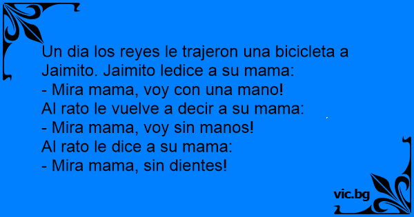 Иванчо се научил да кара колело. Първо го карал с две ръце. След това без една ръка. След това без ръце. И накрая без зъби.