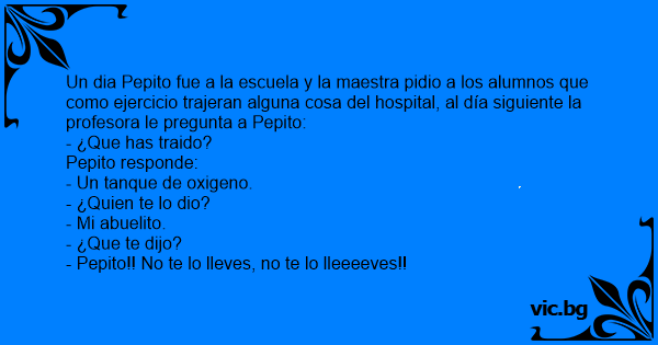 Un dia Pepito fue a la escuela y la maestra pidio a los alumnos que como ejercicio trajeran alguna cosa del hospital, al día siguiente la profesora le pregunta a Pepito: