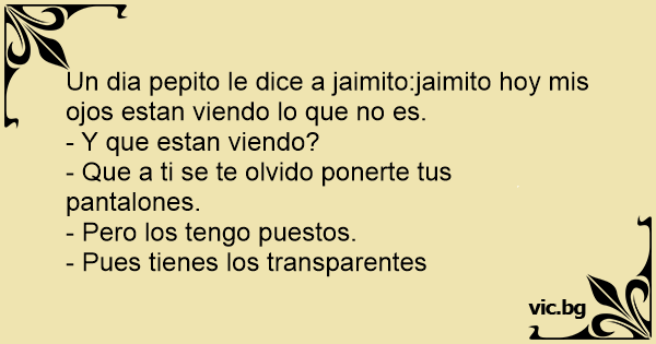 Un dia pepito le dice a jaimito:jaimito hoy mis ojos estan viendo lo que no es.