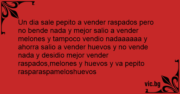 Un dia sale pepito a vender raspados pero no bende nada y mejor salio a vender melones y tampoco vendio nadaaaaaa y ahorra salio a vender huеvоs y no vende nada y desidio mejor vender raspados,melones y huеvоs y va pepito rasparaspameloshuevos