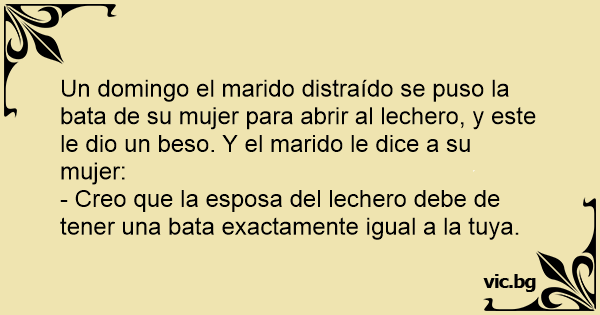 Un domingo el marido distraído se puso la bata de su mujer para abrir al lechero, y este le dio un beso. Y el marido le dice a su mujer: