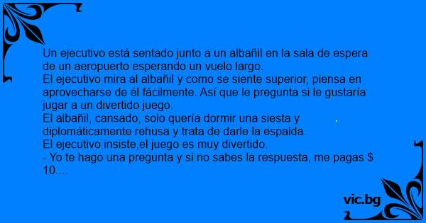 - Yo te hago una pregunta y si no sabes la respuesta, me pagas $ 10. Luego tú haces una pregunta, y si no sé la respuesta, yo te pagaré $ 500 ...¿ok?