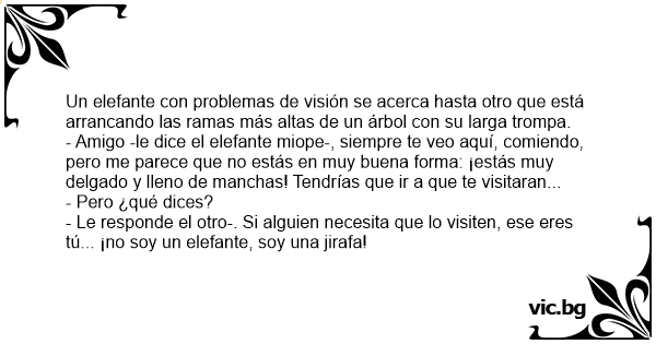 - Amigo -le dice el elefante miope-, siempre te veo aquí, comiendo, pero me parece que no estás en muy buena forma: ¡estás muy delgado y lleno de manchas! Tendrías que ir a que te visitaran...