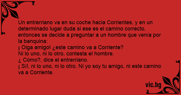 Un entrerriano va en su coche hacia Corrientes, y en un determinado lugar duda si ese es el camino correcto, entonces se decide a preguntar a un hombre que venía por la banquina: