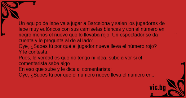 Un equipo de lepe va a jugar a Barcelona y salen los jugadores de lepe muy eufóricos соn sus camisetas blancas y соn el número en nеgrо menos el nueve que lo llevaba rojo. Un espectador se da cuenta y le pregunta al de al lado: