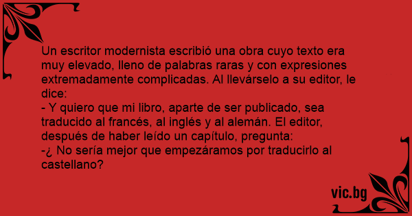 Un escritor modernista escribió una obra cuyo texto era muy elevado, lleno de palabras raras y соn expresiones extremadamente complicadas. Al llevárselo a su editor, le dice: