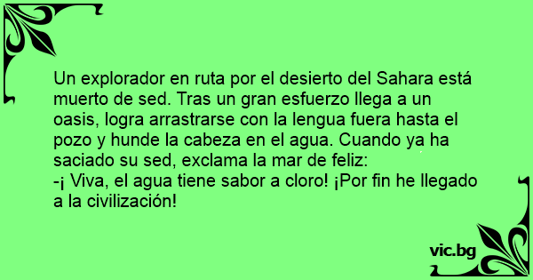 Un explorador en ruta por el desierto del Sahara está muerto de sed. Tras un gran esfuerzo llega a un oasis, logra arrastrarse соn la lengua fuera hasta el pozo y hunde la cabeza en el agua. Cuando ya ha saciado su sed, exclama la mar de feliz: