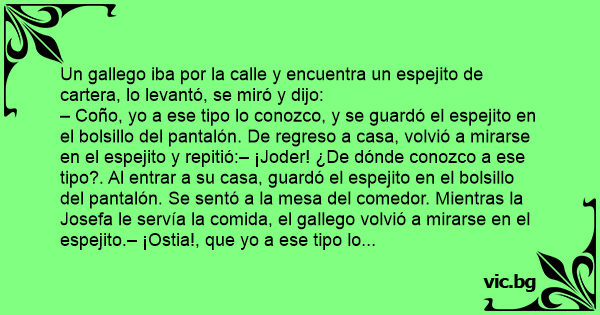 Un gallego iba por la calle y encuentra un espejito de cartera, lo levantó, se miró y dijo: