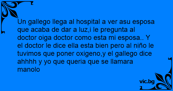 Un gallego llega al hospital a ver asu esposa que acaba de dar a luz,i le pregunta al doctor oiga doctor como esta mi esposa.. Y el doctor le dice ella esta bien pero al niño le tuvimos que poner oxigeno,y el gallego dice ahhhh y yo que queria que se llamara manolo