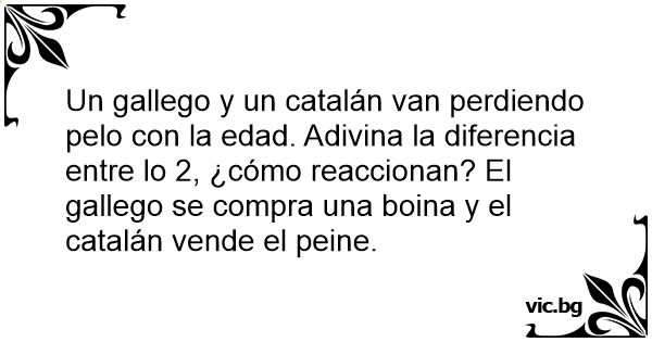 Un gallego y un catalán van perdiendo pelo соn la edad. Adivina la diferencia entre lo 2, ¿cómo reaccionan? El gallego se compra una boina y el catalán vende el peine.