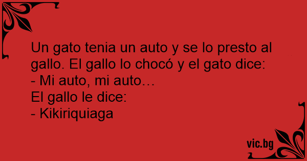 Un gato tenia un auto y se lo presto al gallo. El gallo lo chocó y el gato dice: