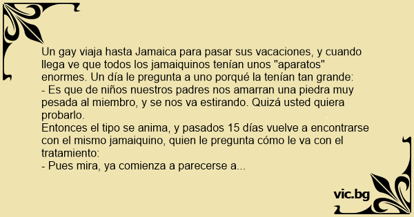 Un gаy viaja hasta Jamaica para pasar sus vacaciones, y cuando llega ve que todos los jamaiquinos tenían unos "aparatos" enormes. Un día le pregunta a uno porqué la tenían tan grande: