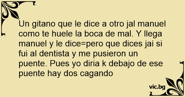 Un gitano que le dice a otro jal manuel como te huele la boca de mal. Y llega manuel y le dice=pero que dices jai si fui al dentista y me pusieron un puente. Pues yo diria k debajo de ese puente hay dos cagando