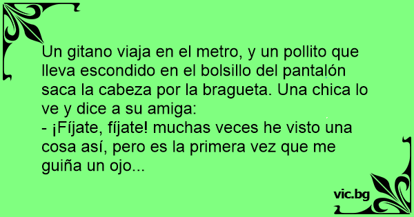 Un gitano viaja en el metro, y un pollito que lleva escondido en el bolsillo del pantalón saca la cabeza por la bragueta. Una chica lo ve y dice a su amiga: