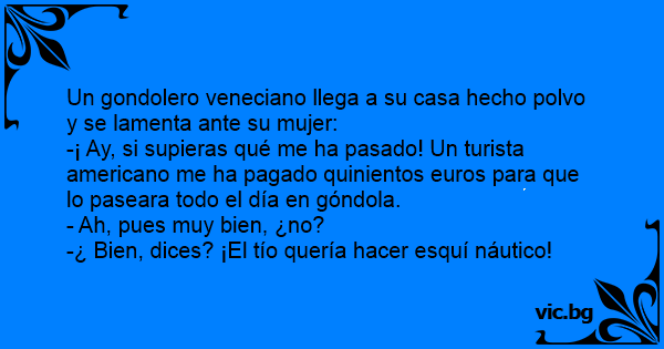 -¡ Ay, si supieras qué me ha pasado! Un turista americano me ha pagado quinientos euros para que lo paseara todo el día en góndola.