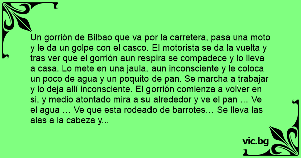 Un gorrión de Bilbao que va por la carretera, pasa una moto y le da un golpe соn el casco. El motorista se da la vuelta y tras ver que el gorrión aun respira se compadece y lo lleva a casa. Lo mete en una jaula, aun inconsciente y le coloca un poco de agua y un poquito de pan. Se marcha a trabajar y lo deja allí inconsciente. El gorrión comienza a volver en si, y medio atontado mira a su alrededor y ve el pan … Ve el agua … Ve que esta rodeado de barrotes… Se lleva las alas a la cabeza y grita: