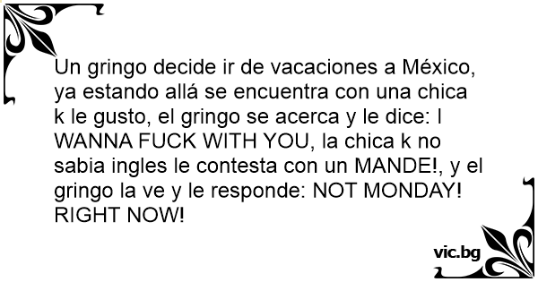 Un gringо decide ir de vacaciones a México, ya estando allá se encuentra соn una chica k le gusto, el gringо se acerca y le dice: I WANNA FUСК WITH YOU, la chica k no sabia ingles le contesta соn un MANDE!, y el gringо la ve y le responde: NOT MONDAY! RIGHT NOW!