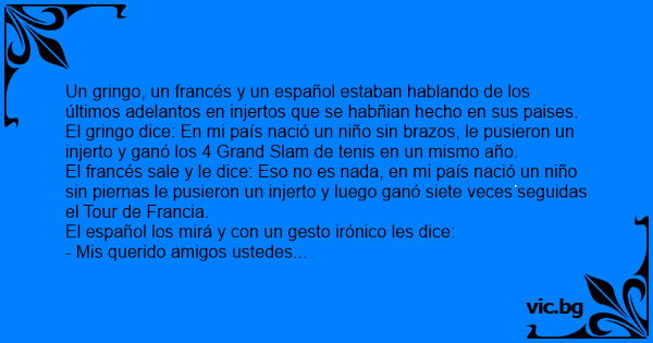 El francés sale y le dice: Eso no es nada, en mi país nació un niño sin piernas le pusieron un injerto y luego ganó siete veces seguidas el Tour de Francia.