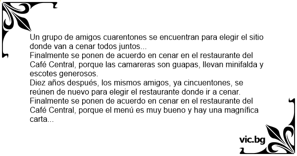 Diez años después, los mismos amigos, ya cincuentones, se reúnen de nuevo para elegir el restaurante donde ir a cenar. Finalmente se ponen de acuerdo en cenar en el restaurante del Café Central, porque el menú es muy bueno y hay una magnífica carta de vinos.