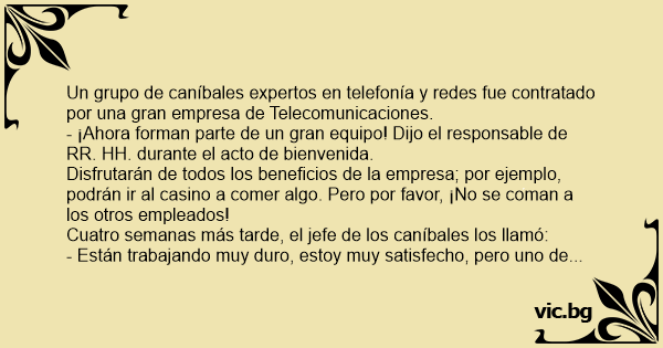 Viisi kannibaalia sai töitä kaupungin virastosta. Ensimmäisenä päivänä pomo toivotti heidät tervetulleiksi: "Olette kaikki meidän tiimiämme. Olkaa ahkeria ja voitte ansaita täällä hyvin ja edetä...