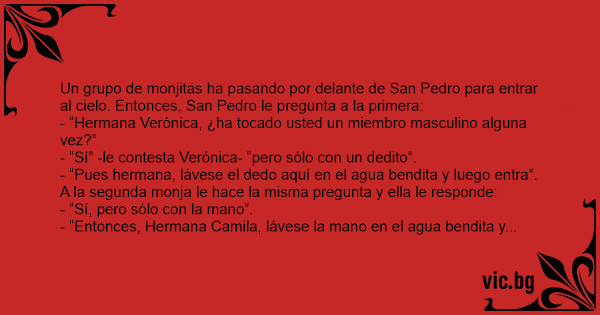 Přijdou čtyři jeptišky do nebe a u nebeské brány na ně čeká svatý Petr. Dříve než je pustí do nebe, ptá se první jeptišky, jestli se někdy dotkla pánského údu. Jeptiška odpoví, že jej pouze viděla....