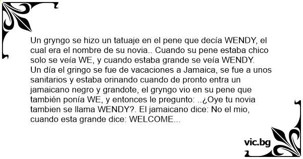 W & Y Honeymoon Tattoo To tattoo Jamaica Τα Τατουάζ. Един пич много обичал приятелката си, която се казвала Wendy и си татуирал нейното име на оная си работа. Willy Weinlaub lässt sich in sein ,bestes Stück "WILLY" tätowieren, wobei man im ,Normalzustand allerdings nur "WY" sieht. ,Als er am Bahnhof in Eisenstadt auf das WC muss ,steht neben ihm ein Schwarzer. Er blinselt neugierig ,hinüber und sieht völlig überrascht "WY". Um viajante japonês estava nos EUA onde arruma uma namorada cujo nome é Wendy. Em homenagem à namorada dele, ele tatuou no pau dele o nome dela; quando ele está com tesão, aparece todo o nome, mas quando não está, aparecem apenas a primeira e última letra do nome da garota: WY. Certo dia ele... Ein Typ hat ne Freundin namens WENDY. Aus liebe lässt er sich ihren Namen auf den Schnidel tätowieren. Im schlaffen Zustand ist allerdings nur WY zu lesen. Auf einem Bahnhofsklo trifft er beim... Die deutsche Urlauberin hat sich einen gut gebauten, dunkelhäutigen Gigolo angelacht und schließlich landen sie im Bett. Als sie bei der Zigarette danach beglückt auf sein erschlafftes... Det var ett europeiskt par som skulle åka på smekmånad till Bahamas. Mannen ville göra tjejen lite glad så han tatuerade han in hennes namn, Wendy, på manslemmen. Dessvärre syntes bara W och Y när... Ein Amerikaner, der seine Freundin aufrichtig liebte, beschloss, ihren Namen auf seinen Penis zu tätowieren. Ihr Name war "WENDY". Die Tätowierung wurde im erigiertem Zustand gemacht, so dass, wenn... A black guy was walking naked on the beach at the nudists. He's got tattooed on his dick his wife's name WENDY. Suddenly he sees a white guy with something written on his dick and asks him: You... Un uomo si fa tatuare sul pisello il nome della sua fidanzata Wendy, di modo che quando c'e l'ha normale si vede solo "wy" e quando gli va in tiro tutto il nome. Un giorno in palestra questo tizio,... A guy decides to do something nice for his girlfriend before they leave on vacation so he gets her name tattooed on his penis. He comes home and shows it to her. She looks at it and says, "That's... Er komt nen Belgische toerist in een Jamaicaans café en bestelt iets om te drinke. Voor hij vertrekt gaat hij nog naar de wc. Daar begint ie te pissen. Plots komt er daar een pekzwarte rasechte Bob... Un italiano è fidanzato e per far vedere che la ama scrive il suo nome "Wendy" nelle parti intime; dopo un po va in Giamaica e va in bagno ed il ragazzo guarda il vicino che sta pisciando e vede... Inskickad av Magnus. Tack för bidraget ;-) En man hade tatuerat in sin frus namn, Helga, på snoppen, men när den var slak så syntes bara H och A. Sen gick han in på pissoaren och fick syn på en... N gringo tenía una novia llamada WENDY y estaba bien enamorado por lo que decidió tatuarse en el **** el nombre de su novia. Cuando el **** estaba tranquilo, sólo se veía WY y cuando estaba muy... Κάποιος τύπος είναι τρελά ερωτευμένος με μια Αγγλίδα που τη λένε Wendy και τη γνώρισε το καλοκαίρι στη θάλασσα. Τέτοια είναι η τρέλα του που αποφασίζει και κάνει στο πέος του τατουάζ με το όνομα... Bula avea tatuat pe instrument “Wendy”. Se duce el in Miami… si cum statea el in apa, apa cam rece, prin slip se vedea doar “Wy”. Se intalneste cu un negru. Se uita la slipul astiua si vede tot...