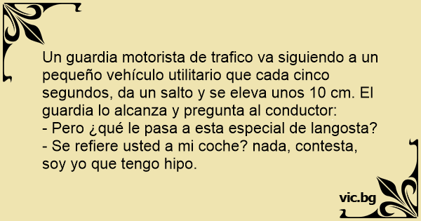 Un guardia motorista de trafico va siguiendo a un pequeño vehículo utilitario que cada cinco segundos, da un salto y se eleva unos 10 cm. El guardia lo alcanza y pregunta al conductor: