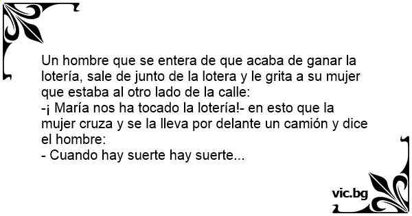 -¡ María nos ha tocado la lotería!- en esto que la mujer cruza y se la lleva por delante un camión y dice el hombre: