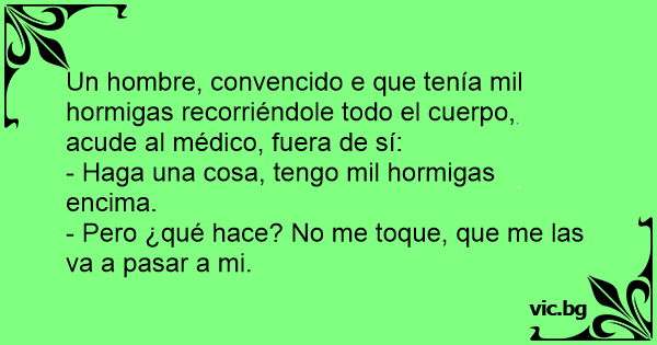 Un hombre, convencido e que tenía mil hormigas recorriéndole todo el cuerpo, acude al médico, fuera de sí: